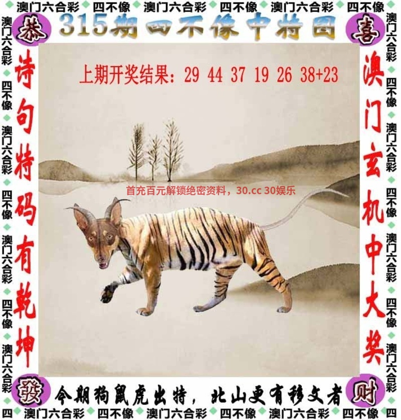 315期:今期狗鼠虎出特,北山更有移文者【开:虎04】 ①杀马牛猴(12.24.36.48.05.17.29.41.10.22.34.46) ②解特肖狗鼠虎羊鸡 |